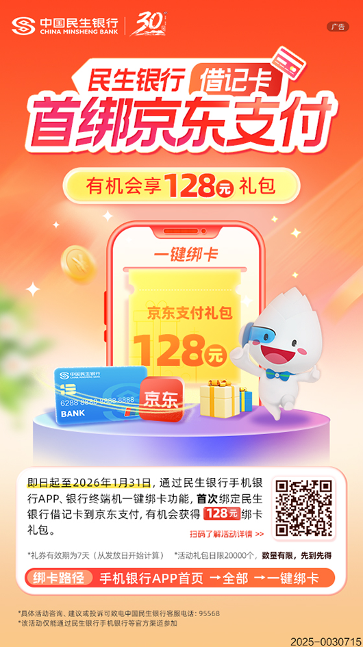 民生银行借记卡首绑京东支付 有机会享128元礼包
