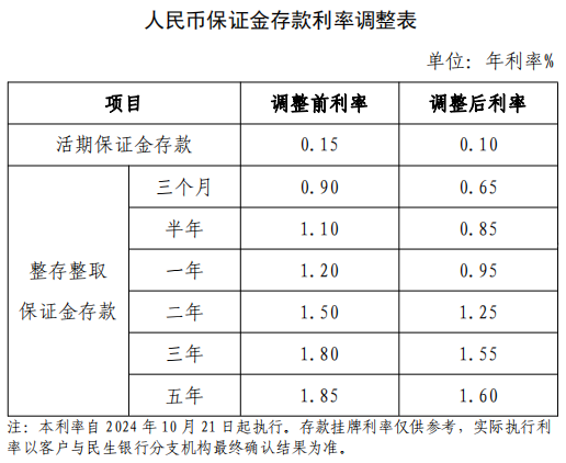 人民币存款利率调整(2024年10月21日起执行)