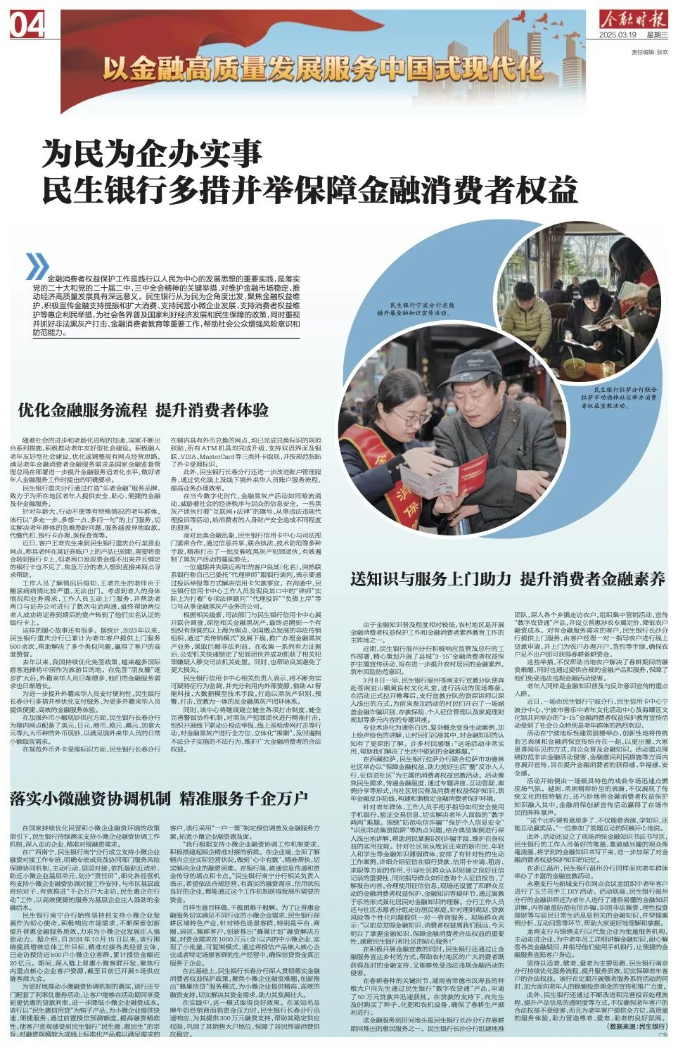 编者按:3月19日,《金融时报》刊发稿件《为民为企办实事 民生银行多措并举保障金融消费者权益》,报道了民生银行从为民为企角度出发,聚焦金融权益维护,积极宣传金融支持提振和扩大消费、支持民营小微企业发展、支持消费者权益维护等惠企利民举措,为社会各界普及国家利好经济发展和民生保障的政策,同时重视并抓好非法黑灰产打击、金融消费者教育等重要工作,帮助社会公众增强风险意识和防范能力。全文如下: