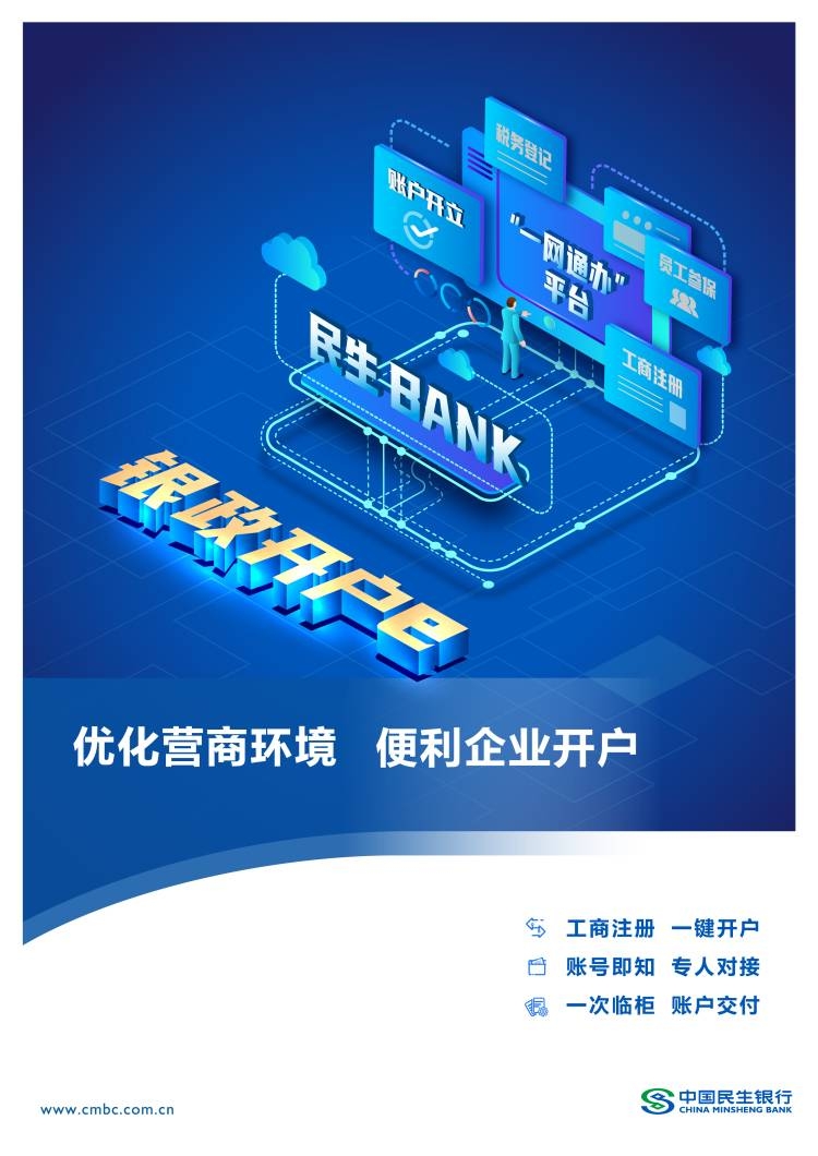 民生银行与各地“一网通办”等政府服务平台(以下简称“平台”)合作,通过系统对接、客户导流、信息共享,为新设企业提供从登记注册到银行开户的“一站式”服务,或为已注册企业客户提供与平台业务相契合的便捷开户服务。