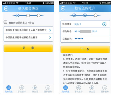 您只需拥有民生借记卡、信用卡、活期一本通、定期一本通账户,即可通过客户端自助注册功能开通手机银行。